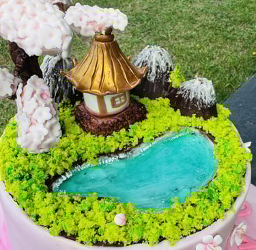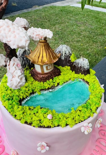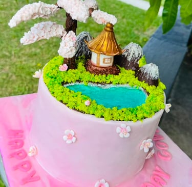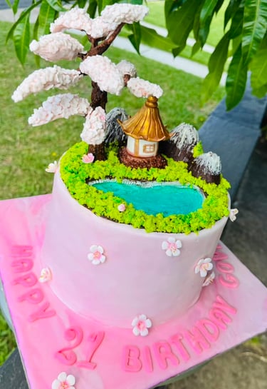 Step into a serene escape with our handcrafted Chinese garden-themed cake! Featuring a delicate cherry blossom tree, golden-roofed pagoda, and a shimmering jelly pond — all made entirely by hand. Perfect for nature lovers and dreamers, this edible masterpiece brings beauty and tranquillity to every celebration.